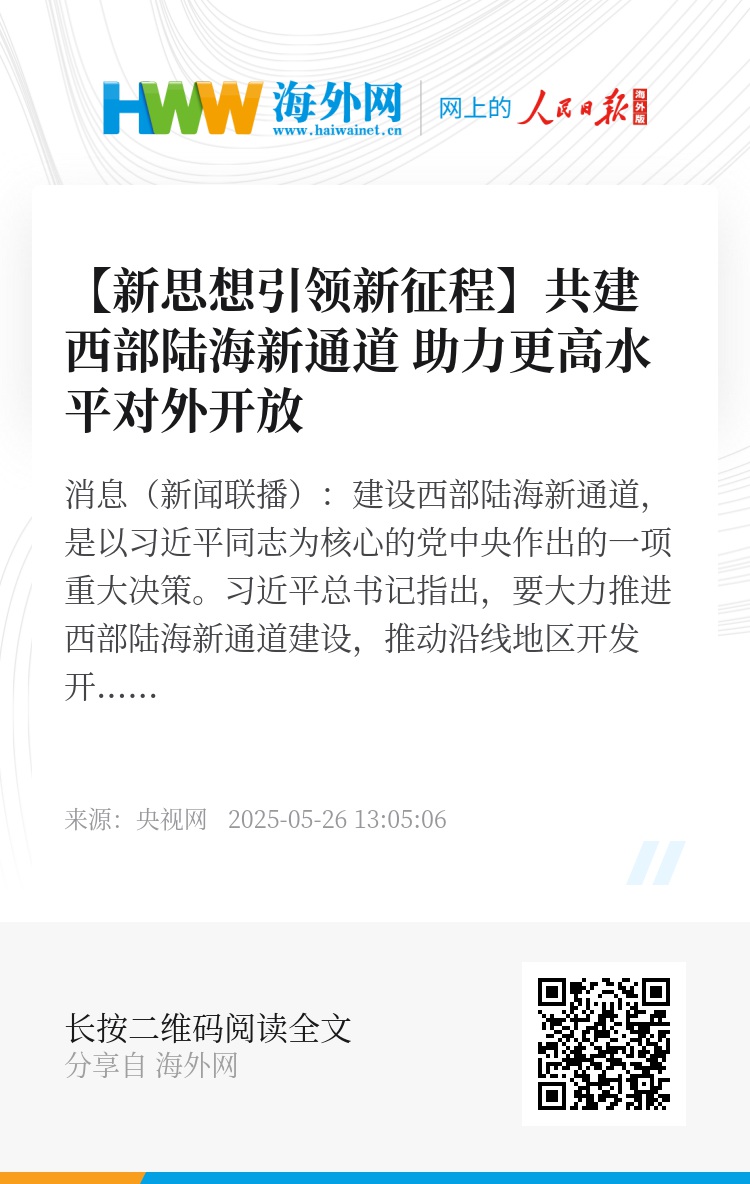 央视网消息(新闻联播):建设西部陆海新通道,是以习近平同志为核心的党中央作出的一项重大决策。习近平总书记指出,要大力推进西部陆海新通道建设,推动沿线地区开发开放,深度融入共建“一带一路”。牢记总书记嘱托,今年以来,沿线各地聚焦改革创新、数字赋能、产业协同三大重点任务,高水平建设西部陆海新通道,助力加快形成“陆海内外联动、东西双向互济”的对外开放新格局。