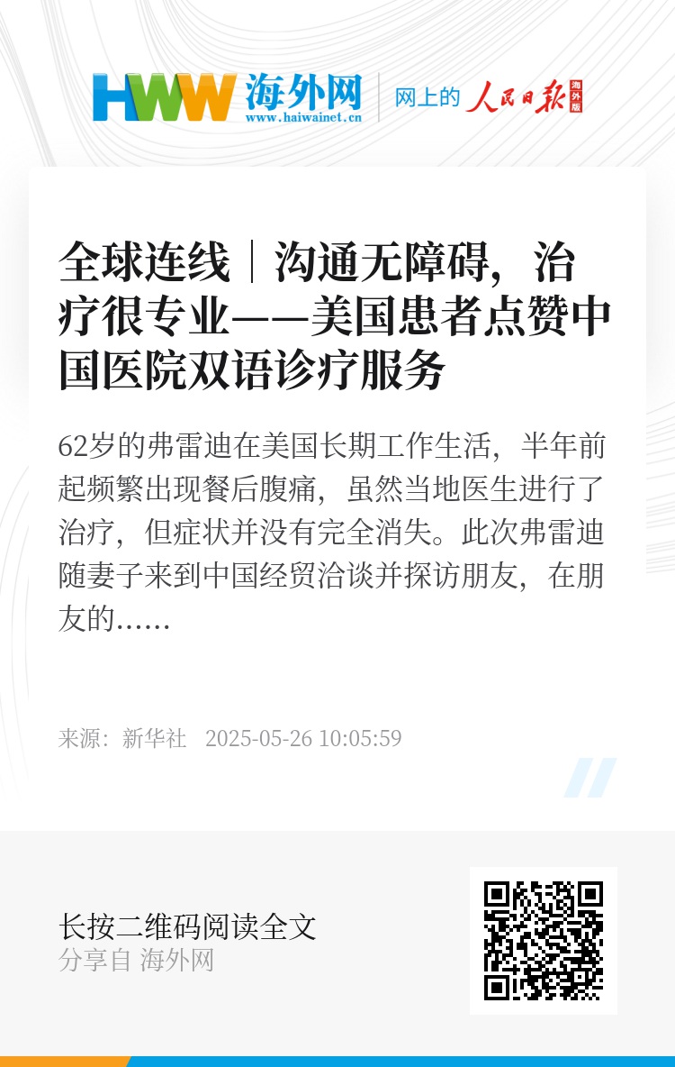 62岁的弗雷迪在美国长期工作生活,半年前起频繁出现餐后腹痛,虽然当地医生进行了治疗,但症状并没有完全消失。此次弗雷迪随妻子来到中国经贸洽谈并探访朋友,在朋友的推荐下,寻求了医疗帮助。住院期间,医生对他的病情进行了评估、检查、会诊,用专业的医疗服务架起了一座连接中外的“健康桥”。