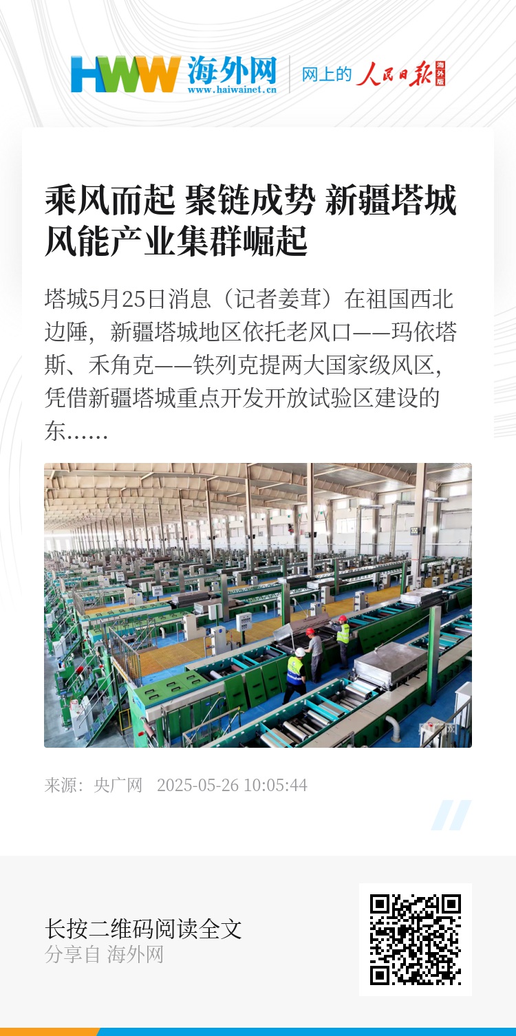 央广网塔城5月25日消息(记者姜茸)在祖国西北边陲,新疆塔城地区依托老风口——玛依塔斯、禾角克——铁列克提两大国家级风区,凭借新疆塔城重点开发开放试验区建设的东风,形成从叶片生产、塔筒制造到整机组装的完整产业链,通过项目落地使绿电赋能产业升级,为“双碳”目标实现和共建“一带一路”贡献强劲动能。
