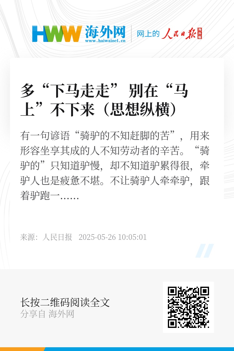 “骑在马上”的领导干部,应该多“下马走走”。和战士走在一起,和乡亲们走在一起,和工人走在一起,和学生走在一起,和科研人员走在一起,和企业经营者走在一起……多看看群众的生活,多听听群众的意见,多了解群众的感受。“下马走走”才能深入一线、了解实情,“下马走走”才能融入群众、增进感情,“下马走走”才能启迪思路、改进方法,“下马走走”,才能正确认识自己,真正摆脱“官气”。别在“马上”不下来,常“下马走走”,才能不忘自己从哪里来,才能知道自己要到哪里去,才能更好地做人民的公仆,更好地为人民服务。(唐剑锋)