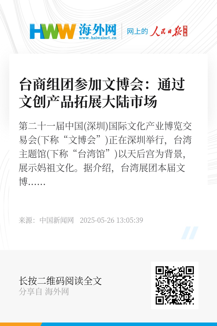 第二十一届中国(深圳)国际文化产业博览交易会(下称“文博会”)正在深圳举行,台湾主题馆(下称“台湾馆”)以天后宫为背景,展示妈祖文化。据介绍,台湾展团本届文博会集结了30多家优质厂商参展,分设“宝岛妈祖”主题形象馆及“厂商专区”两大板块,展览面积共702平方米。现场展出“鹿港花狮”等文创产品,结合庙口小吃、街头表演及趣味游戏互动,让观众沉浸式体验台湾的妈祖文化。(韦杰夫 张璐 王婷 广东报道)