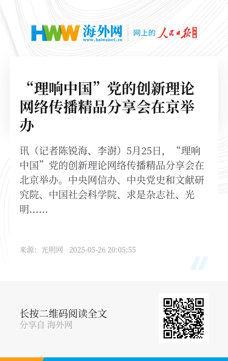 光明网讯(记者陈锐海、李澍)5月25日,“理响中国”党的创新理论网络传播精品分享会在北京举办。中央网信办、中央党史和文献研究院、中国社会科学院、求是杂志社、光明日报社负责同志出席活动。