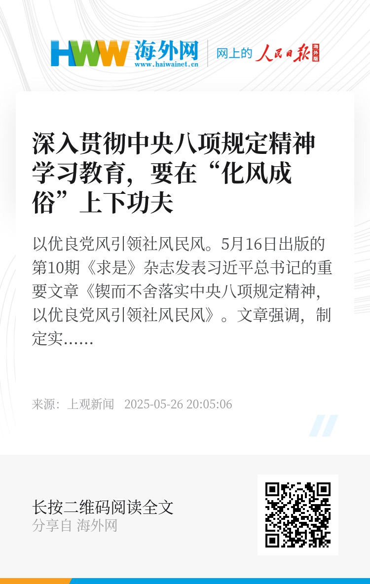 5月16日出版的第10期《求是》杂志发表习近平总书记的重要文章《锲而不舍落实中央八项规定精神,以优良党风引领社风民风》。文章强调,制定实施中央八项规定,是我们党在新时代的徙木立信之举,必须常抓不懈、久久为功,十年不够就二十年,二十年不够就三十年,直至真正化风成俗,以优良党风引领社风民风。