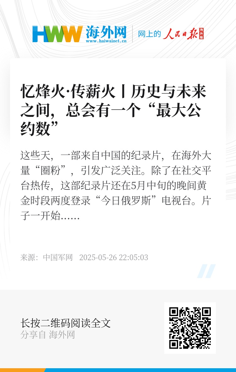 就像在这部纪录片的最后,俄罗斯人民友谊大学教授尤里·塔夫罗夫斯基对记者讲到的,“和平、贸易、文化交流……是21世纪最重要的事情”。80年前的那场胜利,曾书写下人类文明的“最大公约数”;80年后的今天,面对各种风险挑战,如何处理好人与人、国与国之间的关系,“和而不同”——这个来自古老中国而又焕发青春气息的哲学命题,终将成为这个公约数的最佳注脚。