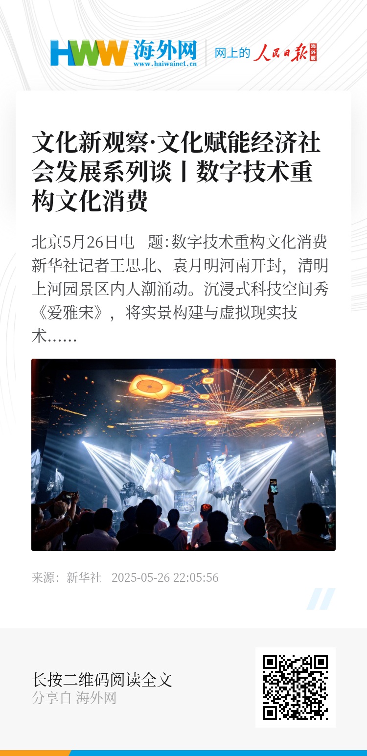 从科技感十足的文旅场景,到满足“个性化定制”的文化产品服务,再到不断升温的线上演播等文化业态……随着虚拟现实、人工智能、大模型等新技术在文化领域的深入应用,更多元、更智能、更便捷的文化消费新体验、新模式持续涌现,进一步激发了市场潜力,也增强了人们的文化获得感、幸福感。