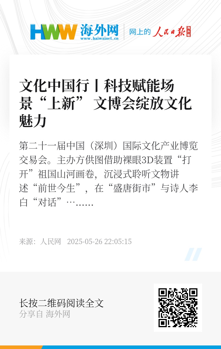 借助裸眼3D装置“打开”祖国山河画卷,沉浸式聆听文物讲述“前世今生”,在“盛唐街市”与诗人李白“对话”……第二十一届中国(深圳)国际文化产业博览交易会(以下简称“文博会”)即将落幕,短短5天,融合深厚文化底蕴和“科技范儿”的文化产业新成果火“出圈”,为观众带来新鲜有趣的参展体验。