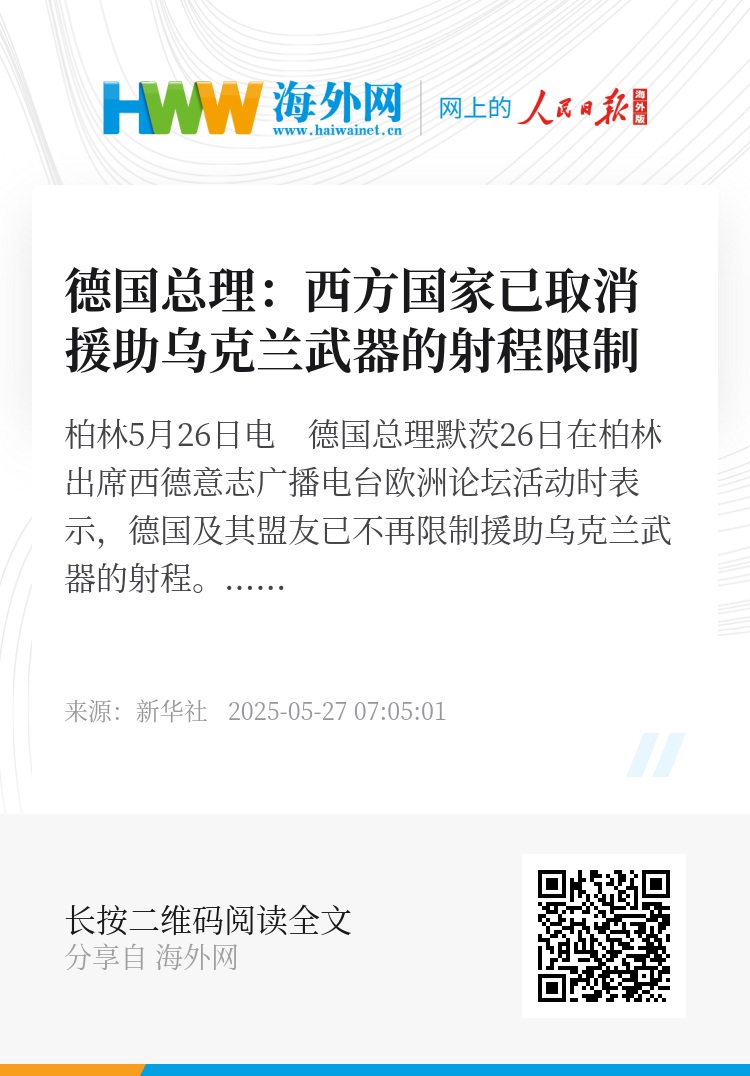 新华社柏林5月26日电 德国总理默茨26日在柏林出席西德意志广播电台欧洲论坛活动时表示,德国及其盟友已不再限制援助乌克兰武器的射程。