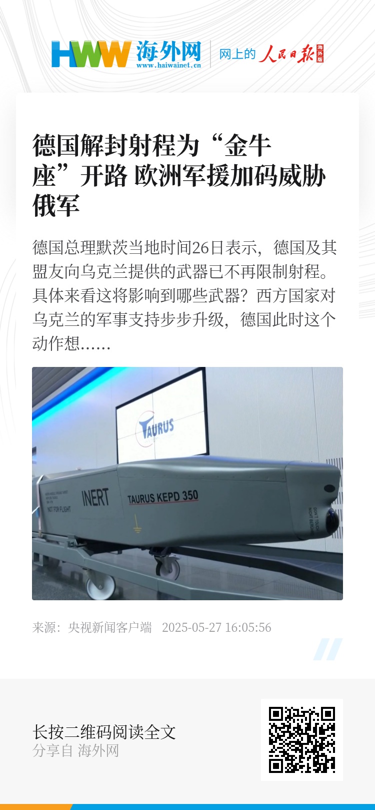总台新闻观察员 魏东旭:在欧洲国家中,德国是向乌克兰提供军事援助的主要国家之一。此前,德国已向乌克兰提供了“豹”式系列主战坦克、“黄鼠狼”履带式步战车、“猎豹”自行高炮等装备,还有单兵武器以及机动部署中近程防空武器系统。如今,德国宣布取消原武器射程限制,此举实则是在为向乌克兰提供“金牛座”巡航导弹做舆论铺垫。若德国向乌提供该导弹,很可能会秘密交付,并协助乌克兰空军完成导弹与战斗机的整合工作。