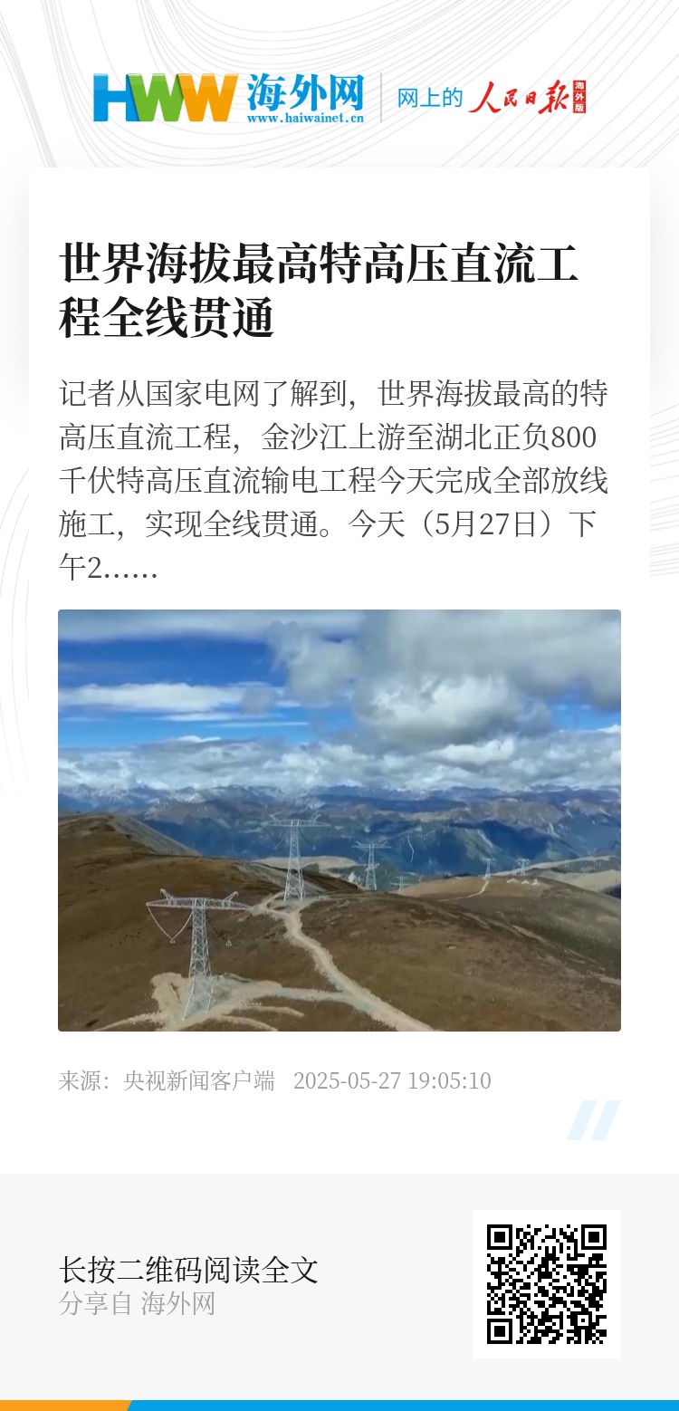 记者从国家电网了解到,世界海拔最高的特高压直流工程,金沙江上游至湖北正负800千伏特高压直流输电工程今天完成全部放线施工,实现全线贯通。