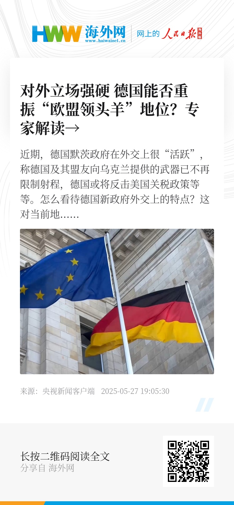 中国国际问题研究院全球治理与国际组织研究所所长 金玲:其次,德国希望在欧盟舞台上重新展现或恢复其领导力。在之前的红绿灯政府时期,由于法德之间存在诸多矛盾,法德轴心长期处于无力状态。默茨上台后明确表示,德国必须与布鲁塞尔更紧密,法德轴心需要加强,同时推动魏玛三角在欧洲发挥领导作用。从目前德国的欧洲政策来看,正朝着这一方向塑造。
