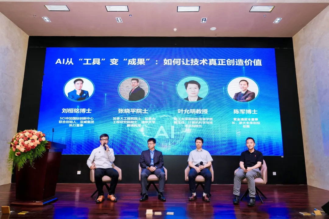 在圆桌对话环节,加拿大工程院院士、清华大学深圳研究生院张晓平、哈尔滨工业大学(深圳)计算机科学与技术学院院长叶允明、紫金港资本董事长陈军、SCI中加国际创新中心(南粤侨创基地)联合创始人刘桓铭博士等嘉宾围绕“如何让技术真正创造价值”这一议题展开多维话题探讨。张晓平院士指出,AI技术从实验室走向市场的关键在于场景精准定义与数据深度治理;叶允明院长以智慧气象为例,垂直领域落地面临数据质量、基础算法、行业深度等跨学科协同创新是突破技术转化壁垒的核心路径;陈军董事长从长期资本视角提出,投资生态对AI技术产业化至关重要,不同区域投资人对风险容忍度不同,资本在转化中角色多元是当前AI项目投资的核心考量;刘桓铭博士则结合南粤侨创基地实践,分享了“技术孵化-场景对接-资本赋能”的全链条服务模式。