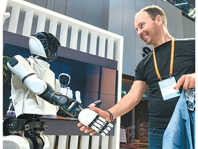 博览会上,星动纪元、宇树科技等企业生产的人形机器人与外国观众互动。