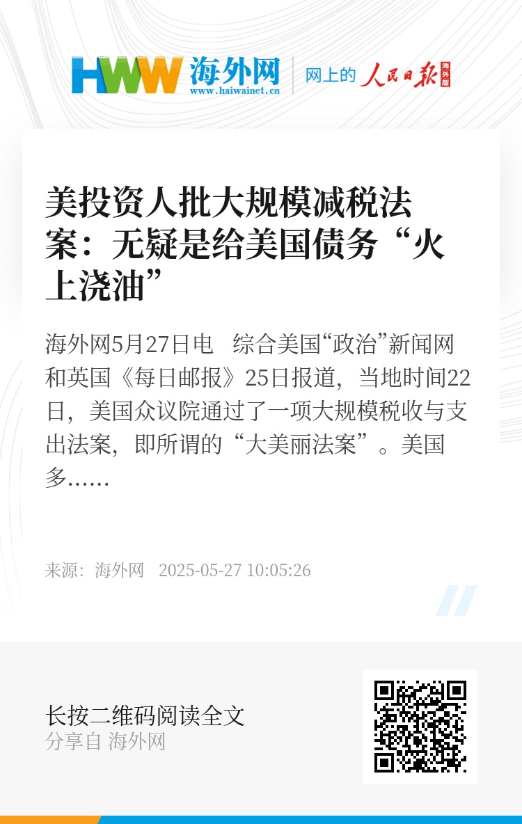 海外网5月27日电 综合美国“政治”新闻网和英国《每日邮报》25日报道,当地时间22日,美国众议院通过了一项大规模税收与支出法案,即所谓的“大美丽法案”。美国多名投资人批评该法案无疑是给美国债务“火上浇油”。