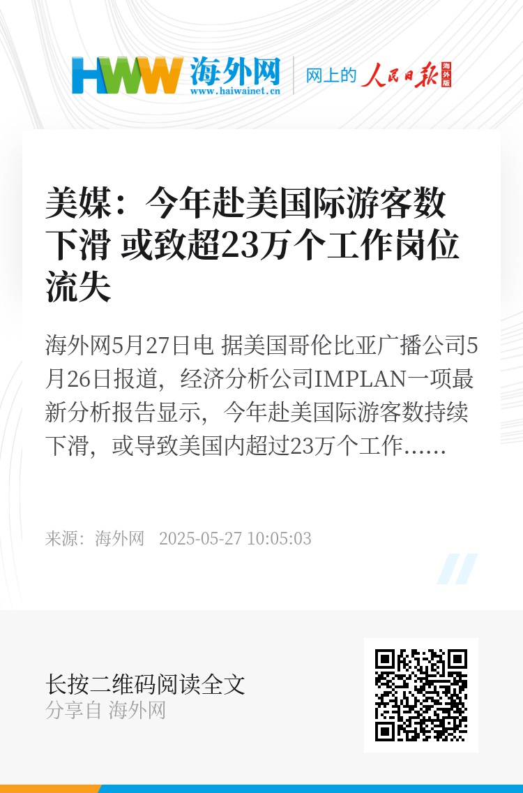 报道称,赴美旅游人数的减少或将破坏美国旅游业的稳定,而旅游业在支撑美国经济方面发挥着至关重要的作用。IMPLAN首席经济学家兼数据官珍妮·索瓦尔森表示,从就业角度看,赴美国际游客人数下滑将产生非常显著的影响。世界旅游及旅行理事会的数据显示,近10%的美国就业岗位都与旅游业相关。