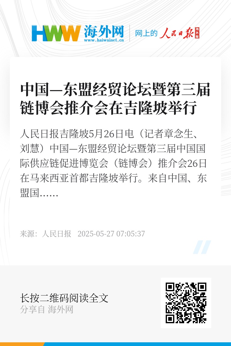 人民日报吉隆坡5月26日电(记者章念生、刘慧)中国—东盟经贸论坛暨第三届中国国际供应链促进博览会(链博会)推介会26日在马来西亚首都吉隆坡举行。来自中国、东盟国家的贸易投资促进机构、商协会和企业代表近200人参加。