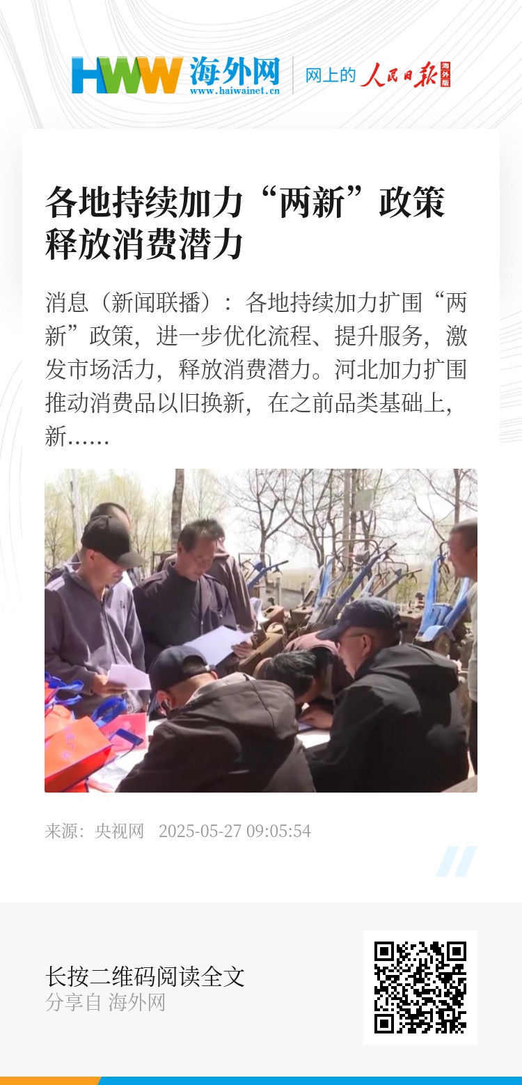央视网消息(新闻联播):各地持续加力扩围“两新”政策,进一步优化流程、提升服务,激发市场活力,释放消费潜力。