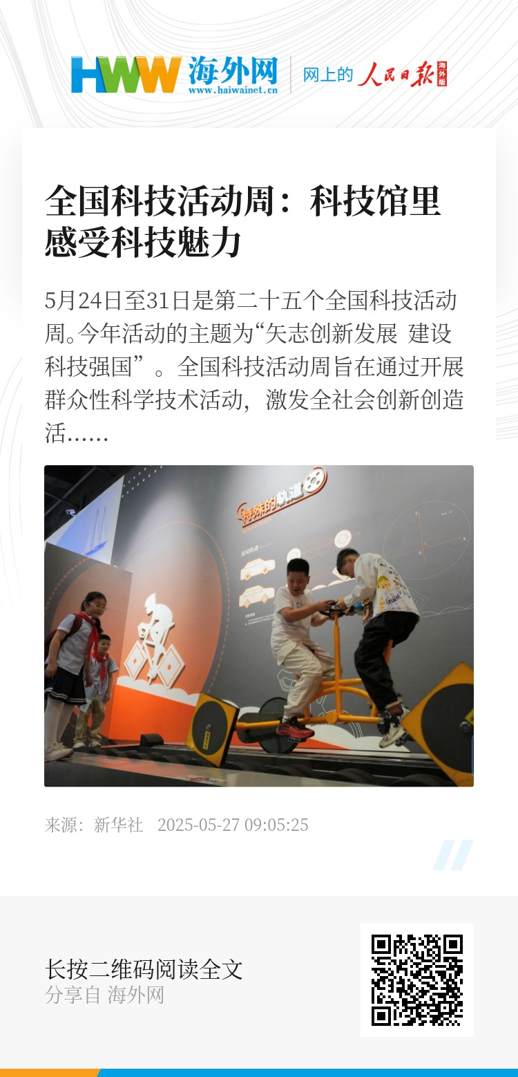 5月24日至31日是第二十五个全国科技活动周。今年活动的主题为“矢志创新发展 建设科技强国”。全国科技活动周旨在通过开展群众性科学技术活动,激发全社会创新创造活力。