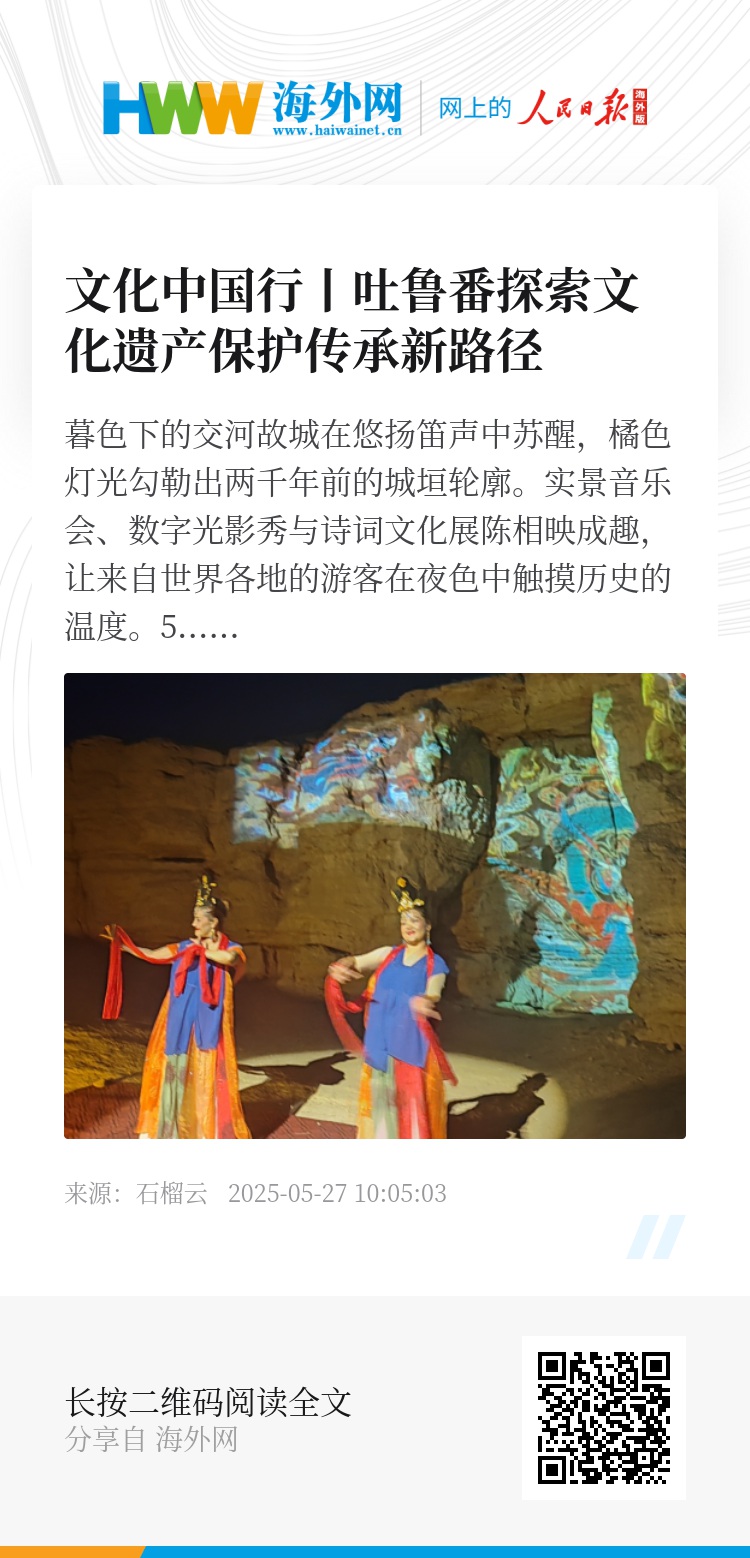 当雅尔湖石窟的AR投影重现壁画原貌,当“夜游交河”“夜读苏公塔”实景演绎等成为吐鲁番夜间文旅经济亮点,吐鲁番的文化遗产保护已突破传统模式,越来越多遗迹在实现保护的基础上对外开放,深藏在丝路历史中的故事通过丰富手段得以活态展现。如今,吐鲁番市13处全国重点文物保护单位已开放9处,占比达70%,其国保单位、石窟寺开放数量均位居全疆第一。其中,雅尔湖石窟创新应用VR全景导览技术,成为新疆智慧文博的重要代表。在“火洲文物会说话”品牌下,沉睡的典籍化为鲜活的时代语言,70余个文物故事累计获得超50万次传播。