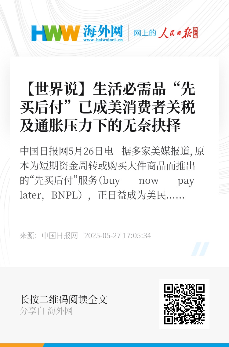 中国日报网5月26日电 据多家美媒报道,原本为短期资金周转或购买大件商品而推出的“先买后付”服务(buy now pay later,BNPL),正日益成为美民众购买基本生活必需品的无奈之选,这一现象背后折射出美国消费者财务状况的严峻分化。