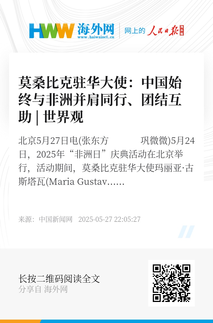 中新网北京5月27日电(张东方 巩微微)5月24日,2025年“非洲日”庆典活动在北京举行,活动期间,莫桑比克驻华大使玛丽亚·古斯塔瓦(Maria Gustava)在接受中新网专访时表示,中国始终与非洲并肩同行,团结互助、共克时艰。