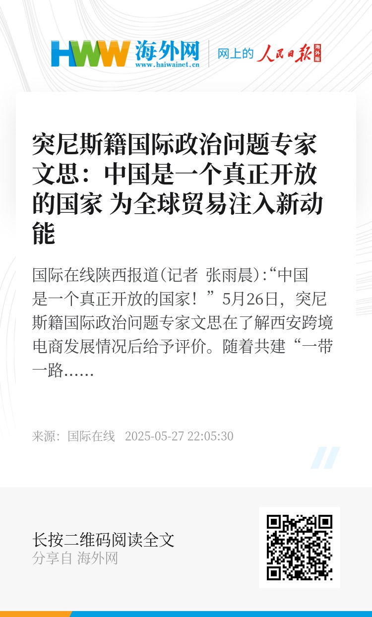 国际在线陕西报道(记者 张雨晨):“中国是一个真正开放的国家!”5月26日,突尼斯籍国际政治问题专家文思在了解西安跨境电商发展情况后给予评价。
