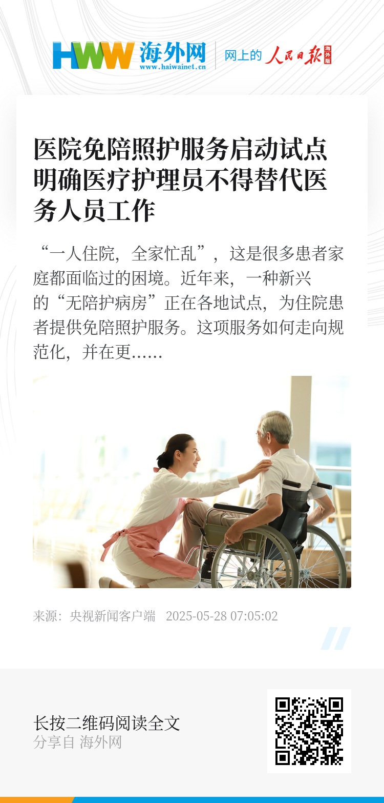 “一人住院,全家忙乱”,这是很多患者家庭都面临过的困境。近年来,一种新兴的“无陪护病房”正在各地试点,为住院患者提供免陪照护服务。这项服务如何走向规范化,并在更多地方、更多医院普及?来看多部门近日联合印发的《医院免陪照护服务试点工作方案》。