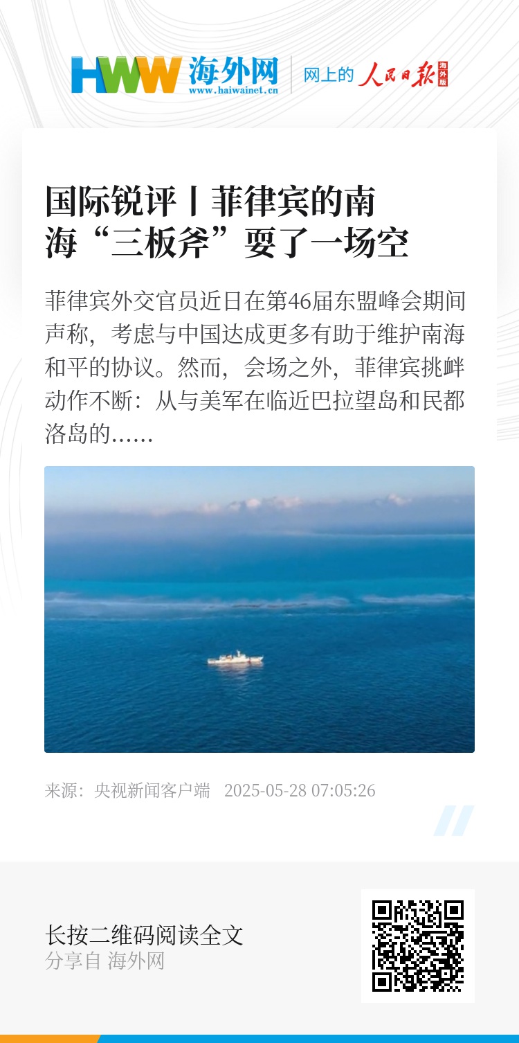 就在一周前,中国与东盟完成自贸区3.0版谈判,区域发展迎来了新机遇。在这个关键当口,菲律宾执意挑衅滋事、试图“倚美制华”,既不符合菲国内民众期待,也不会得到其他南海周边国家的支持,更与地区和平与发展的潮流格格不入,最终只会沦为美国及其他大国战略竞争的牺牲品。菲方不妨利用东盟峰会等重要交流平台,好好看清世界及地区发展的大势。