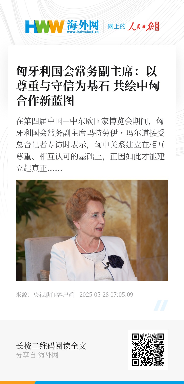 当被问及两国友好关系秘诀时,玛特劳伊・玛尔道表示,“相互尊重”与“守信”是核心。“我们始终强调,匈中关系建立在相互尊重、相互认可的基础上,尤其是我们坚持‘一个中国’原则,尊重对方的核心利益。正因为如此,我们之间才能建立起真正的友谊和伙伴关系。”她坚信,长期合作必将深化友谊,让双方未来可以继续相互信赖、彼此依靠。