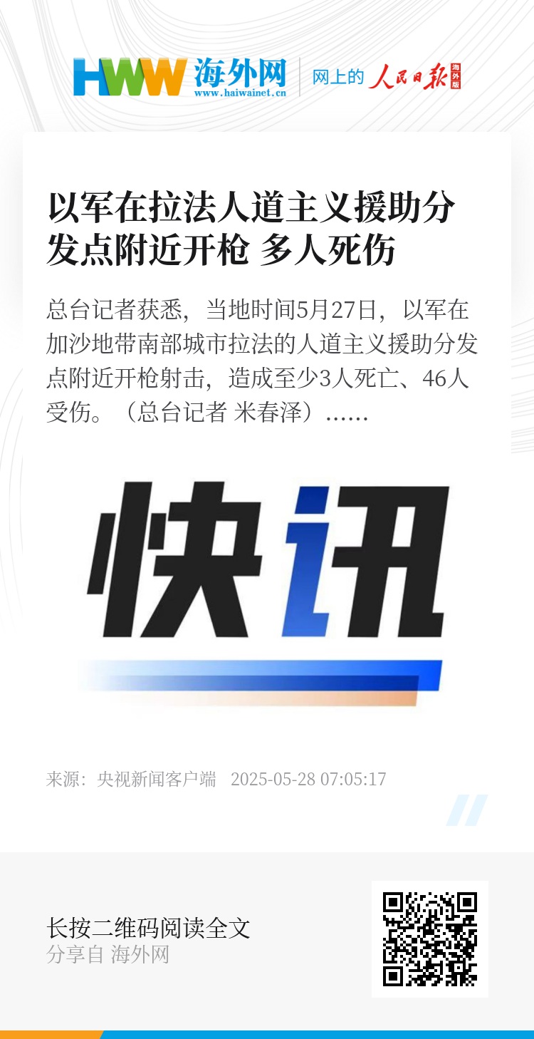 总台记者获悉,当地时间5月27日,以军在加沙地带南部城市拉法的人道主义援助分发点附近开枪射击,造成至少3人死亡、46人受伤。(总台记者 米春泽)