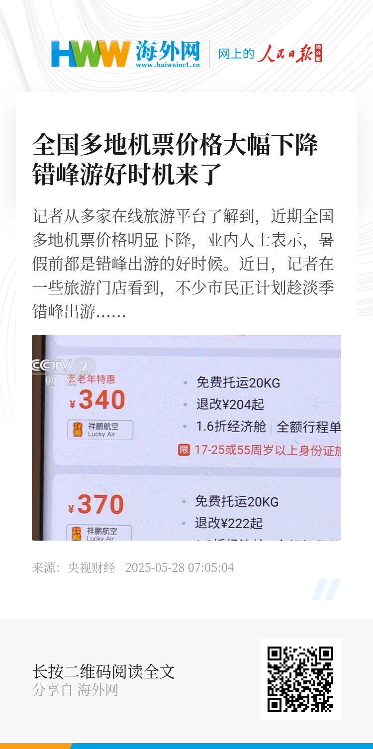 记者从多家在线旅游平台了解到,近期全国多地机票价格明显下降,业内人士表示,暑假前都是错峰出游的好时候。