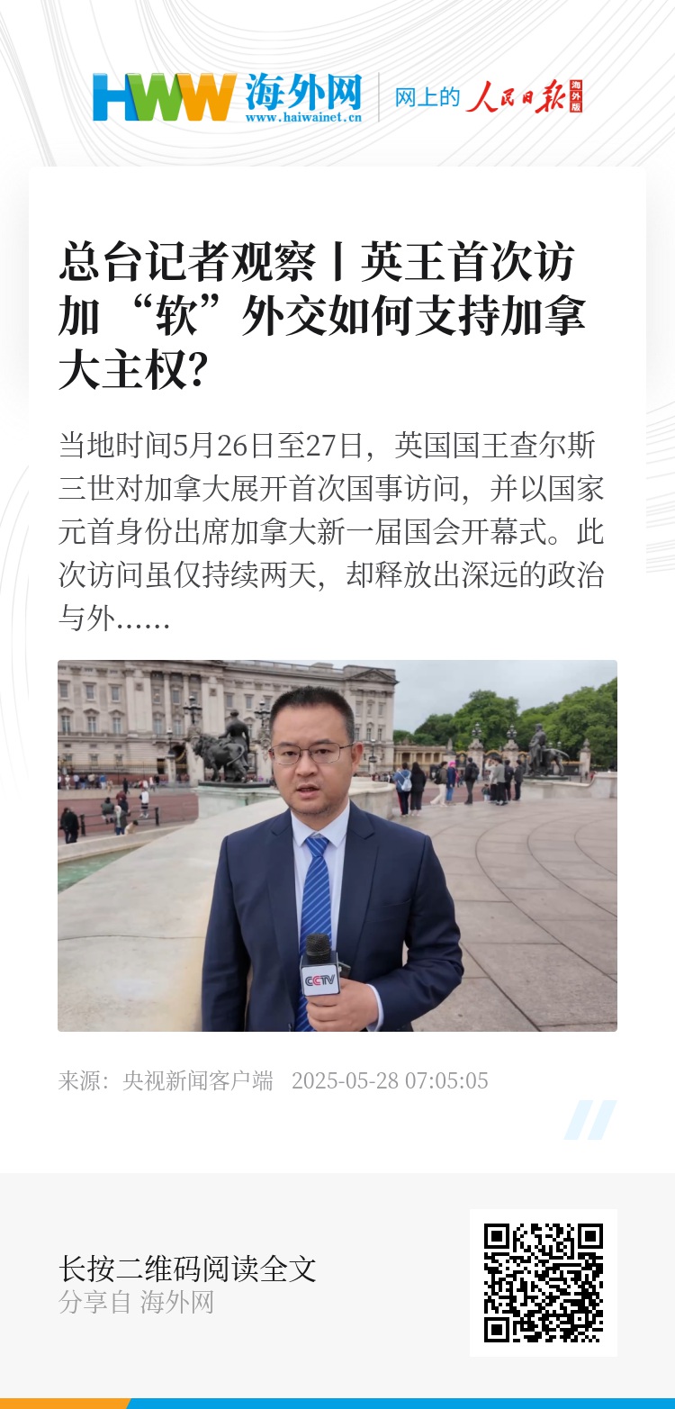 总台记者 陈林聪:最后,也是最重要的一点,英国国王此行,不仅是一次传统的国事访问,更是一次英国和加拿大精心策划的对美国霸权的不满。英国不仅支持加拿大的主权立场,更希望通过英联邦这一平台,强化自身在国际体系中的存在感与影响力。英国与美国的盟友关系毋庸置疑,但在涉及主权、尊严和制度认同的问题上,英国也在寻求某种“外交独立性”。可以说,英国正在努力在“英美特殊关系”与“英联邦传统联系”之间,找到一个战略平衡点。(总台记者 陈林聪)