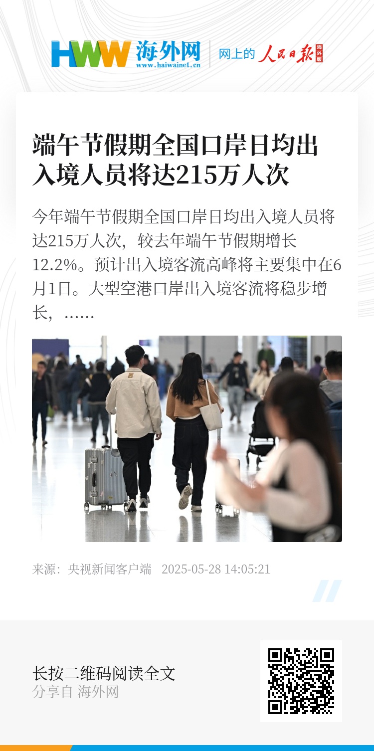 今年端午节假期全国口岸日均出入境人员将达215万人次,较去年端午节假期增长12.2%。预计出入境客流高峰将主要集中在6月1日。大型空港口岸出入境客流将稳步增长,上海浦东、广州白云、北京首都、成都天府、深圳宝安等国际机场日均出入境人员预计分别为10万、4.8万、4.6万、1.7万、1.6万人次。端午节期间粤港澳三地将举办多场龙舟赛事和大型活动,同时叠加儿童节和周末,预计将吸引大量内地居民出境旅游和港澳居民返乡探亲,毗邻港澳陆路口岸通关流量将明显增多。其中,深圳罗湖、福田、深圳湾、莲塘、广深港高铁西九龙站口岸日均出入境人员预计将分别达到23万、21万、15万、11万、10万人次,珠海拱北、港珠澳大桥、青茂、横琴口岸日均出入境人员预计将分别达到36.7万、11万、10.6万、10万人次。