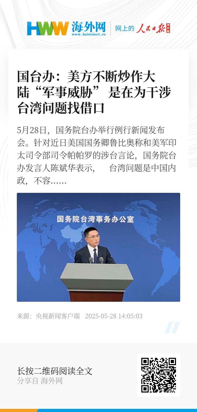 5月28日,国务院台办举行例行新闻发布会。针对近日美国国务卿鲁比奥称和美军印太司令部司令帕帕罗的涉台言论,国务院台办发言人陈斌华表示, 台湾问题是中国内政,不容任何外来干涉。美方一些人居心叵测,不断炒作大陆“军事威胁”,持续鼓噪“让台湾拖住大陆”,渲染台海战争氛围,不过是在为干涉台湾问题找借口,为美国军工复合体敛财。事实一再证明,美国始终以“美国利益优先”,他们的所作所为是在“害台”“毁台”,是要把台湾同胞当炮灰。