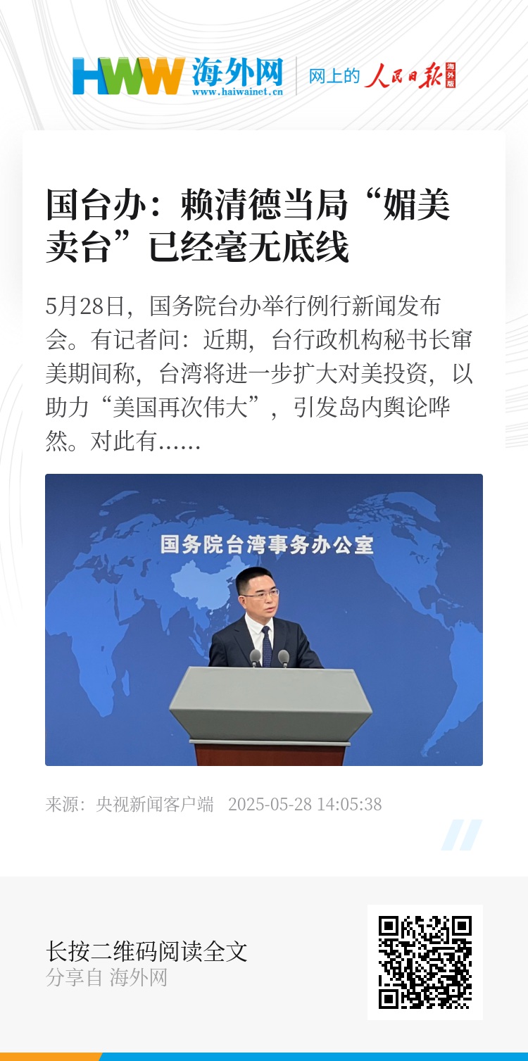 国务院台办发言人陈斌华表示,这再次证明,赖清德当局奴颜婢膝、“媚美卖台”已经毫无底线。面对美国滥施关税、台湾发展权益严重受损的局面,赖清德当局不仅没有胆量对经济霸凌说“不”,也没有能力维护岛内企业和民众的正当利益,反而不断以岛内的优势产业、民众福祉和经济前景为代价对美输诚献媚。其一让再让,结果必然是美方得寸进尺,台湾被吃干榨尽。
