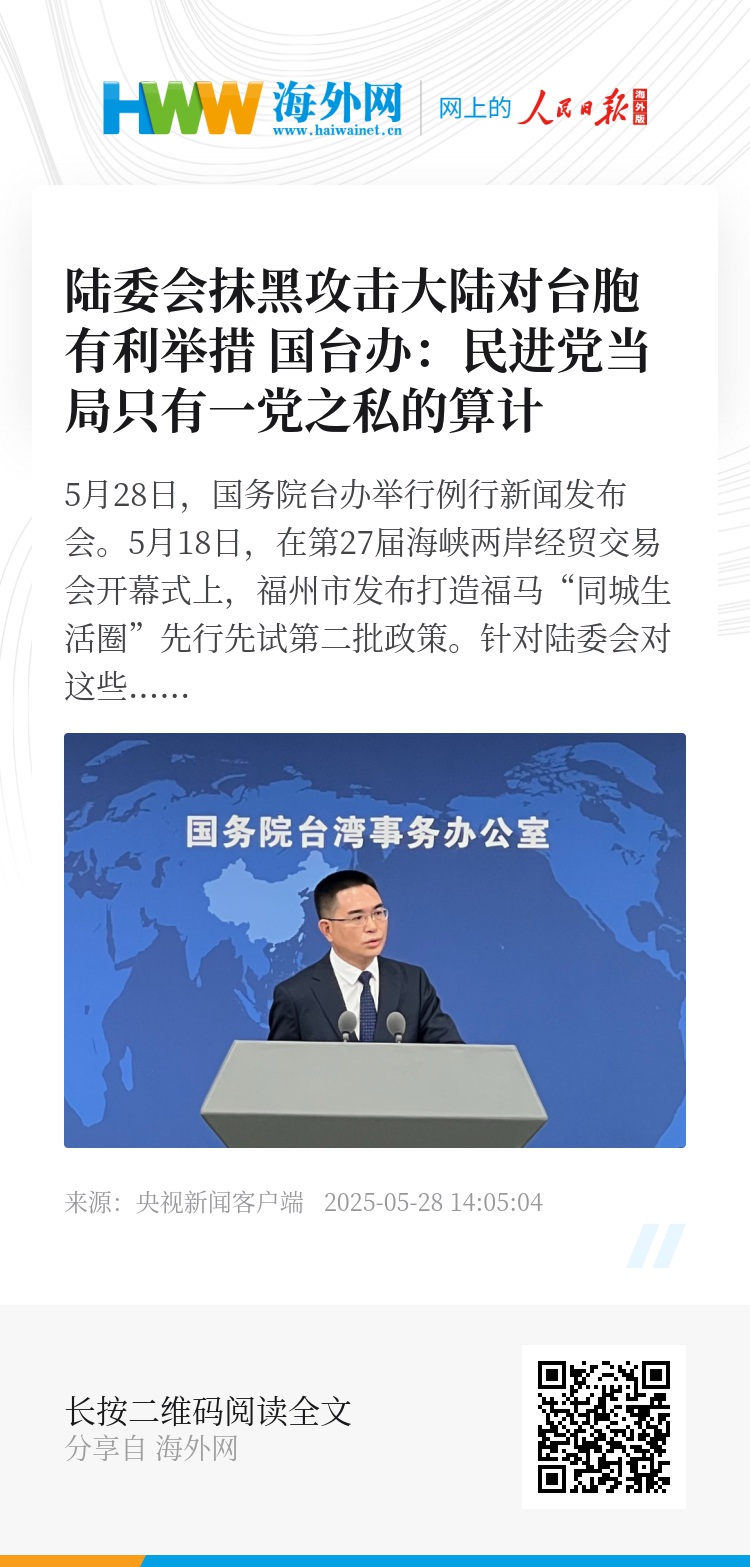 5月28日,国务院台办举行例行新闻发布会。5月18日,在第27届海峡两岸经贸交易会开幕式上,福州市发布打造福马“同城生活圈”先行先试第二批政策。针对陆委会对这些举措的抹黑攻击,国台办发言人陈斌华表示,为推动福马“同城生活圈”建设,造福台湾同胞,福州市在第27届海峡两岸经贸交易会期间发布打造福马“同城生活圈”先行先试第二批政策。这批政策包含融入两岸共同市场、提升生活便利、深化民间交流等三方面共10条,将进一步推动福州与马祖产业合作,为马祖企业和居民在进出口贸易、开拓共同市场、落实同等待遇、增进人文交流等方面提供更多支持。