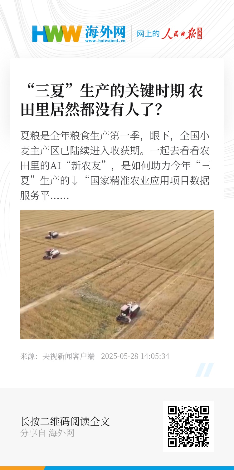 夏粮是全年粮食生产第一季,眼下,全国小麦主产区已陆续进入收获期。一起去看看农田里的AI“新农友”,是如何助力今年“三夏”生产的↓
