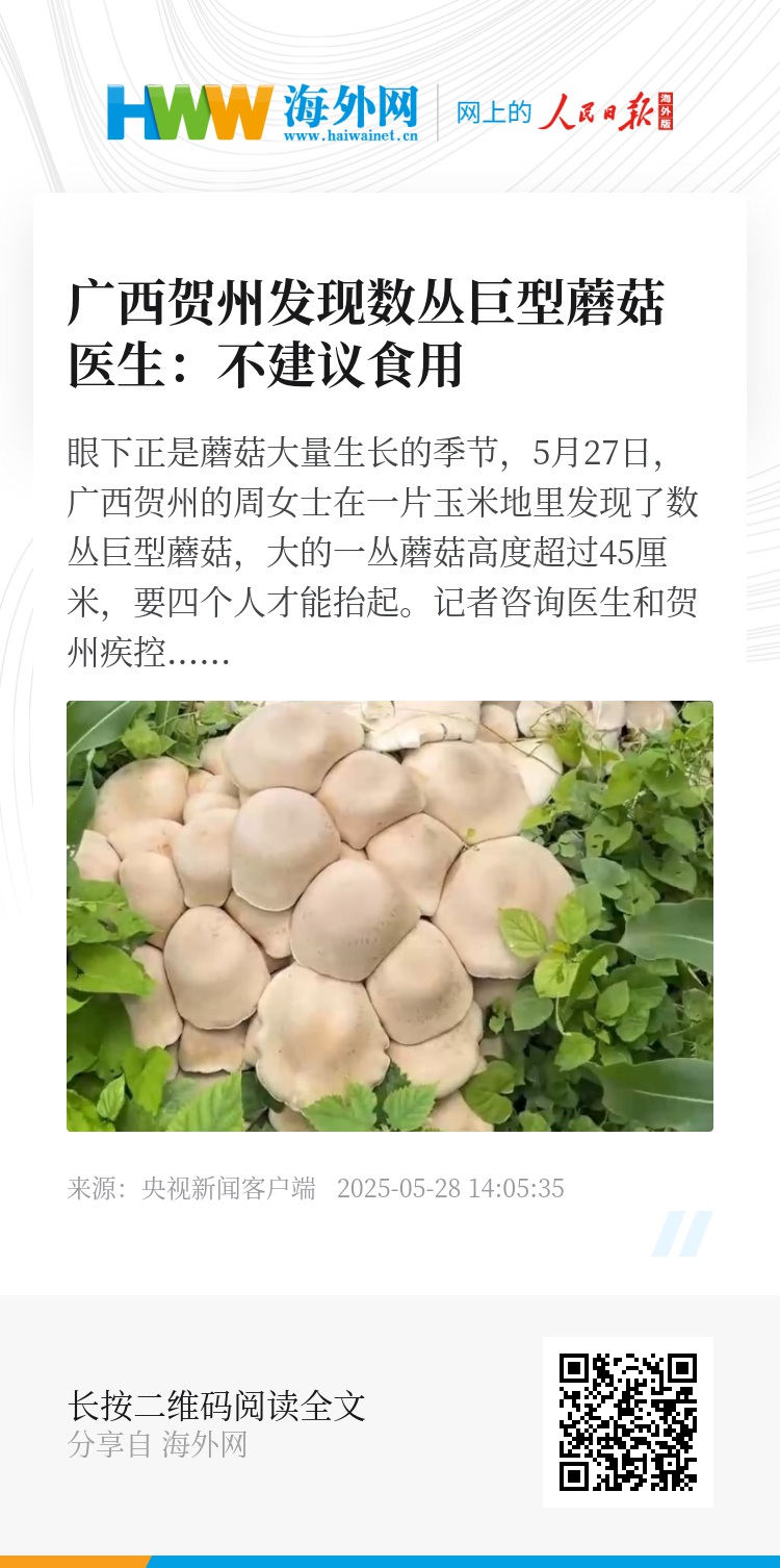 眼下正是蘑菇大量生长的季节,5月27日,广西贺州的周女士在一片玉米地里发现了数丛巨型蘑菇,大的一丛蘑菇高度超过45厘米,要四个人才能抬起。记者咨询医生和贺州疾控的工作人员,他们提醒,野生蘑菇生长环境并非一成不变,同一丛蘑菇群也有可能混入毒株蘑菇。野生蘑菇有风险,不建议食用。
