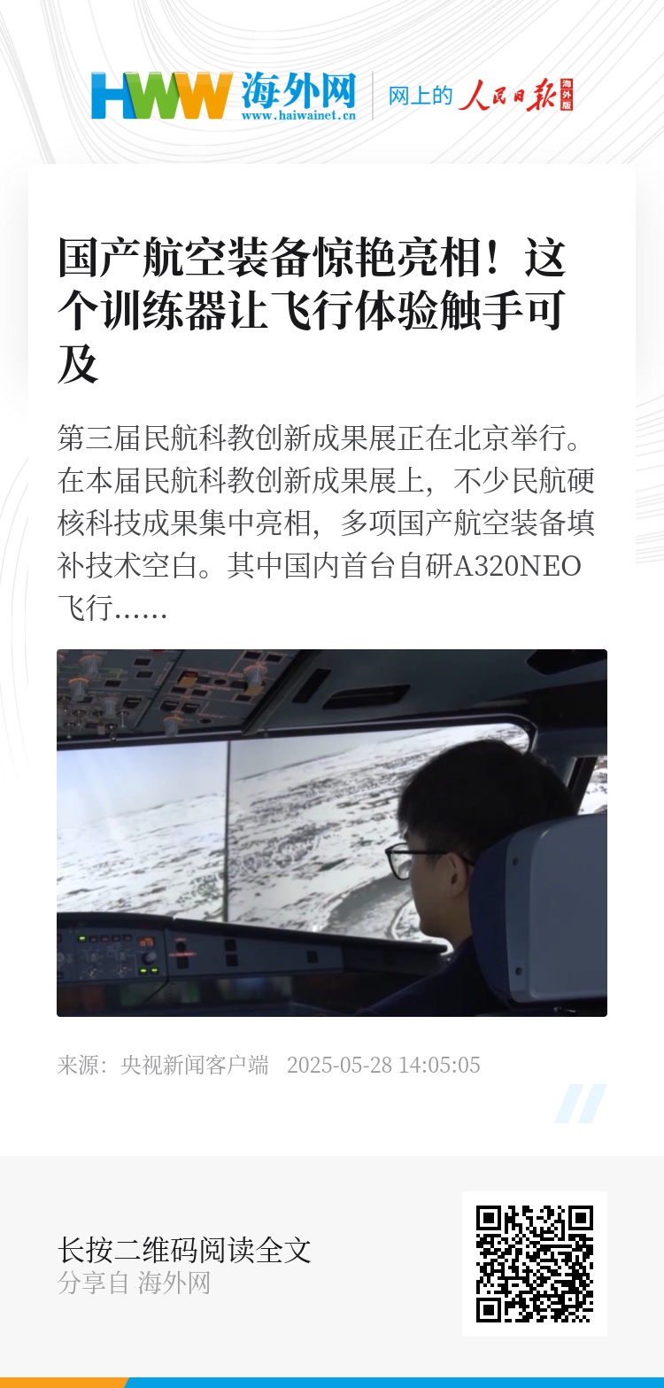 第三届民航科教创新成果展正在北京举行。在本届民航科教创新成果展上,不少民航硬核科技成果集中亮相,多项国产航空装备填补技术空白。其中国内首台自研A320NEO飞行与导航程序训练器吸引了不少观众前来体验。