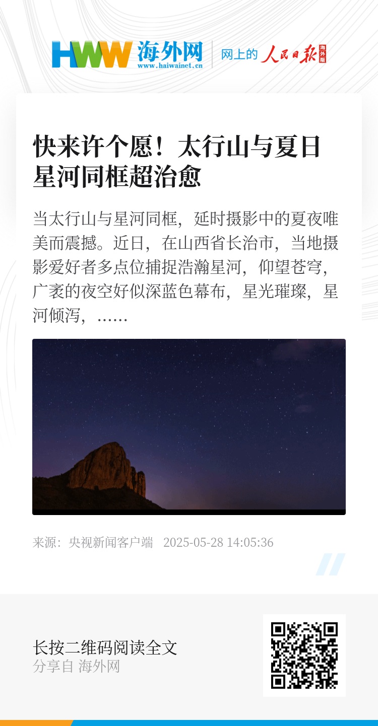当太行山与星河同框,延时摄影中的夏夜唯美而震撼。近日,在山西省长治市,当地摄影爱好者多点位捕捉浩瀚星河,仰望苍穹,广袤的夜空好似深蓝色幕布,星光璀璨,星河倾泻,奇幻而浪漫,瞬间被治愈。戳视频,一起许个愿吧。 (总台记者 岳旭辉 崔肖冉 孙兵兵)