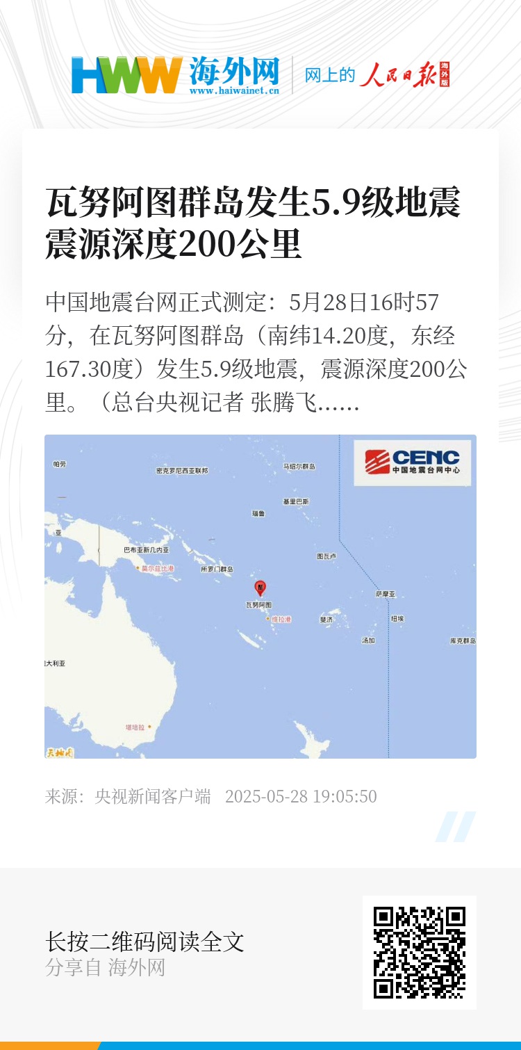 中国地震台网正式测定:5月28日16时57分,在瓦努阿图群岛(南纬14.20度,东经167.30度)发生5.9级地震,震源深度200公里。
