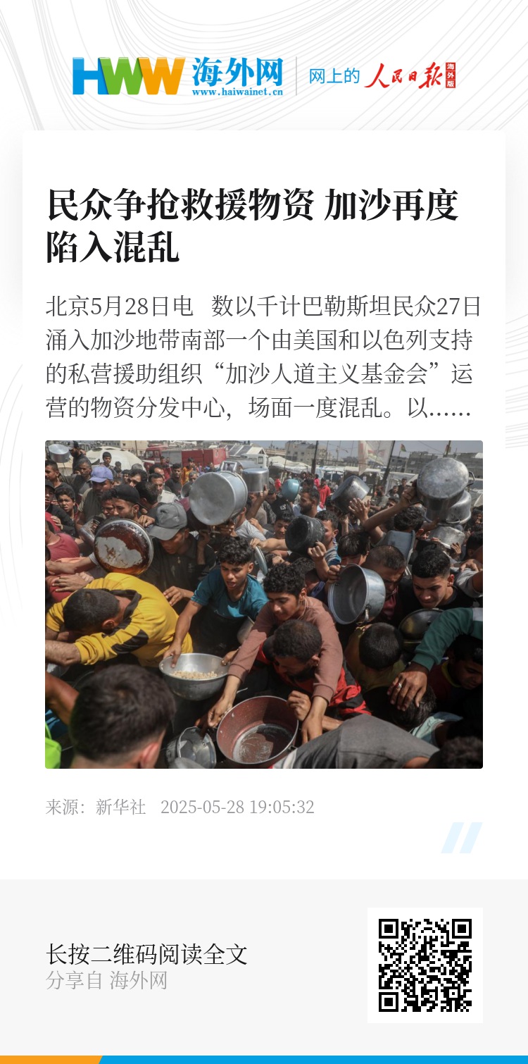 新华社北京5月28日电 数以千计巴勒斯坦民众27日涌入加沙地带南部一个由美国和以色列支持的私营援助组织“加沙人道主义基金会”运营的物资分发中心,场面一度混乱。以色列军方鸣枪示警后,民众惊慌逃离。