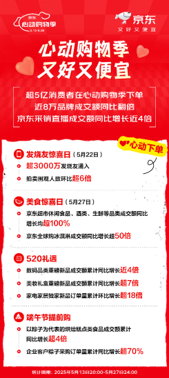 5月13日晚8点开启后,心动购物季高潮迭起,发烧友惊喜日当天超3000万发烧友涌入京东,拍卖围观人数环比超6倍,美食惊喜日,休闲食品、酒类、生鲜等品类成交额同比增长均超100%。截至5月27日24点,超5亿消费者在京东心动购物季下单,近8万品牌成交额同比翻倍,京东采销直播成交额同比增长近4倍。