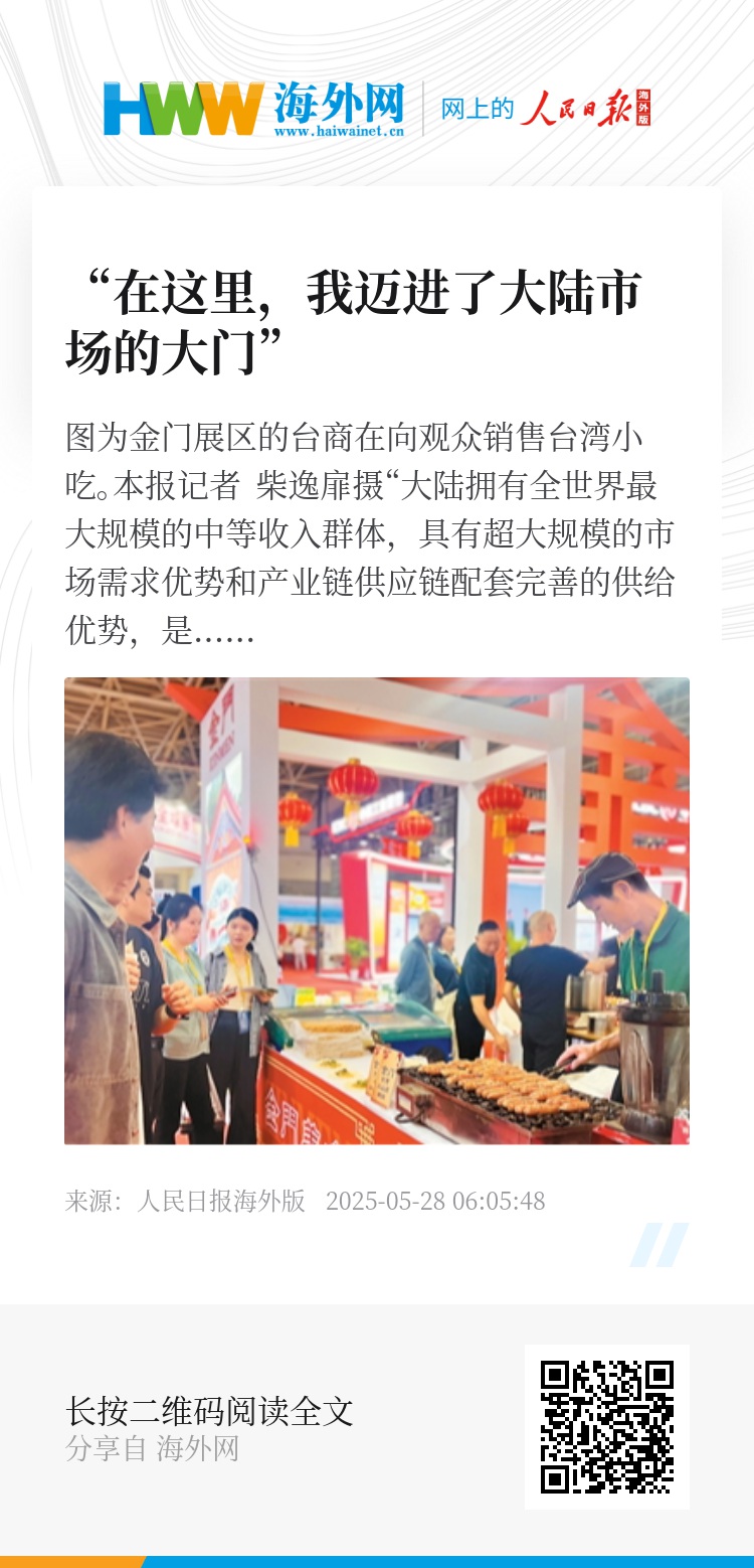 “大陆拥有全世界最大规模的中等收入群体,具有超大规模的市场需求优势和产业链供应链配套完善的供给优势,是广大台商台企扎根发展、投资兴业最理想的沃土和抵御各种风险挑战最安全可靠的依托。”在近日于福建福州举办的第二十七届海峡两岸经贸交易会(简称“海交会”)上,中共中央台办、国务院台办副主任潘贤掌致辞时说。