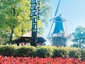 库肯霍夫公园的郁金香花海与风车相映成趣。
