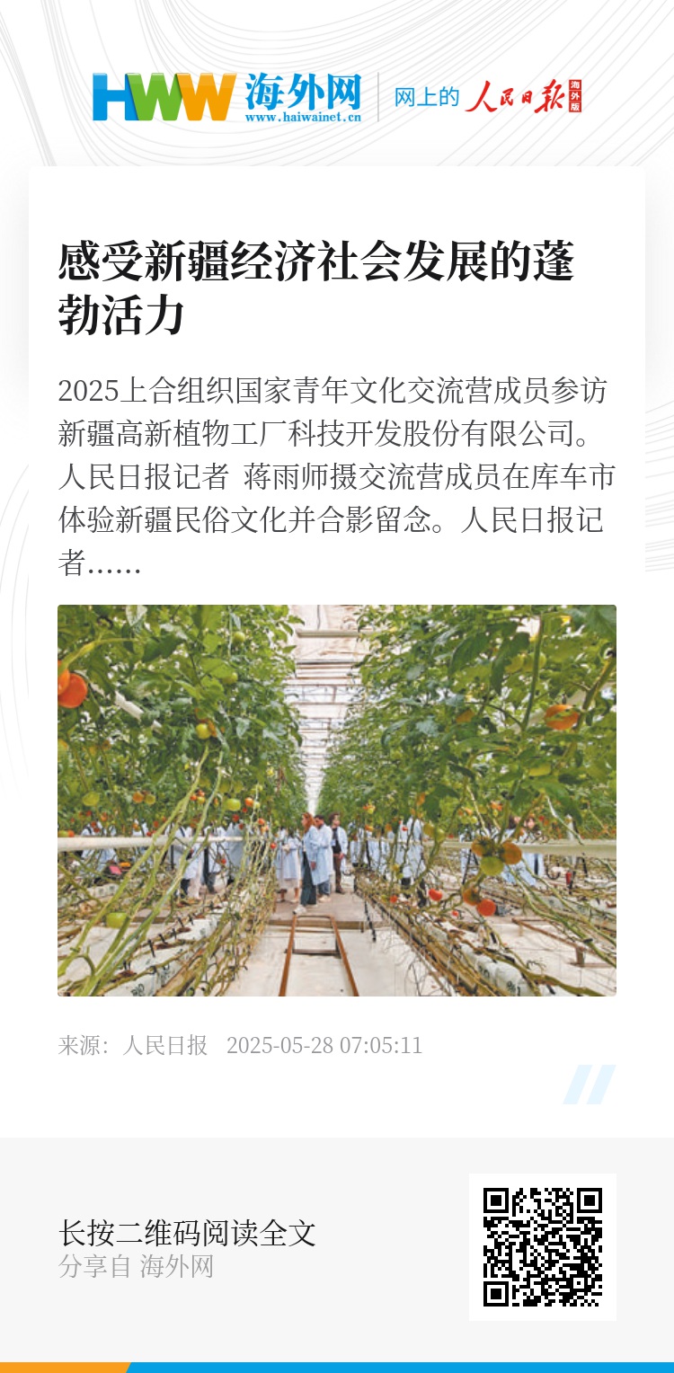 此次新疆调研行,交流营成员既领略了丝路文化的独特魅力,也看到了一个充满活力与创新发展的新疆。“对我来说,这段旅程将是非常美好的回忆。因为我在这里遇见了许多闪亮的人,感受到不同文明的交流融合,也见证了新疆各族人民的幸福生活。”俄罗斯塔斯社高级记者安娜·福米娜说。(记者 曹树林 阿尔达克 李欣怡)