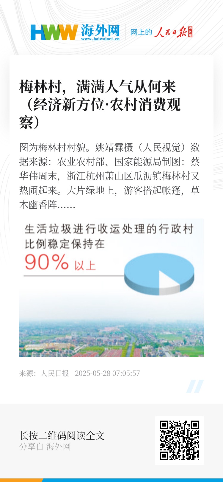 梅林村的答案是,找回“诗意田园”。“千万工程”持之以恒推进,梅林村开展“三改一拆”、“五水共治”、垃圾分类,逐步建设起环境优美、生态宜居的美丽乡村。