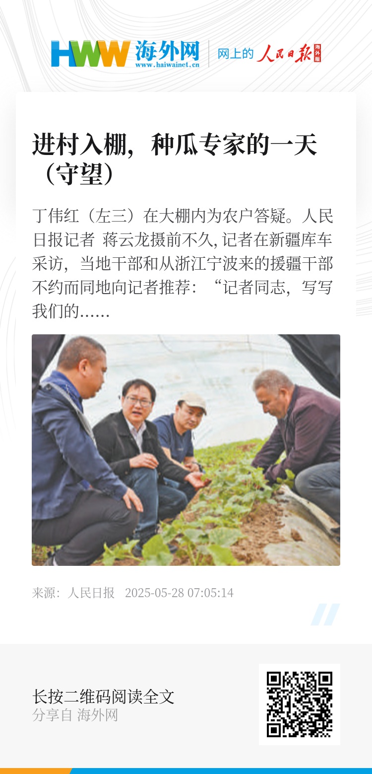 “在知道丁老师的故事以后,浙江省援疆指挥部特别设立了援疆科技特派员制度,为像丁老师这样的农技员开展工作提供更多便利。”宁波市援疆指挥部党委书记、指挥长,库车市委副书记杨勇说,“这项制度也能激励和支持更多农业专家将良种良技送到新疆来,目前宁波的南瓜、草莓都在新疆得到大面积推广。”