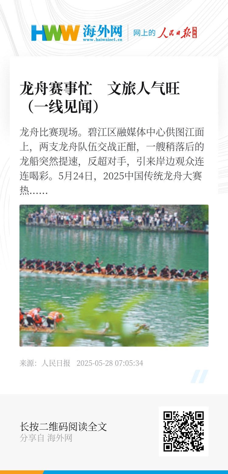 碧江区文体广电旅游局局长张伟华说:“我们以龙舟赛为抓手,推动文旅产业发展。去年端午龙舟赛期间,铜仁市碧江区接待游客49.57万人次;今年,我们要以更优质的服务、更丰富的活动,欢迎各地游客的到来。”(记者 陈隽逸)