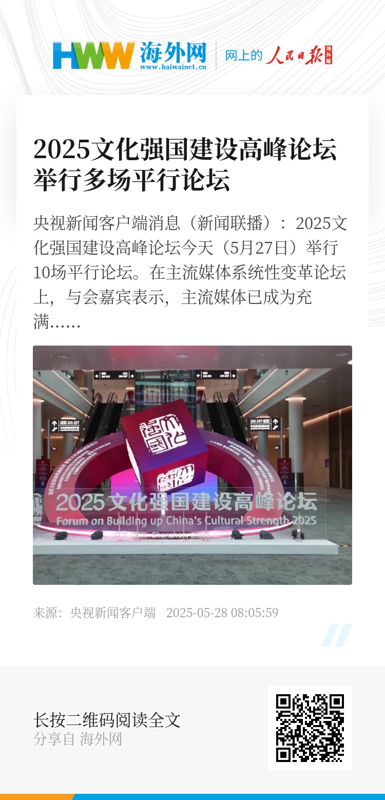 央视新闻客户端消息(新闻联播):2025文化强国建设高峰论坛今天(5月27日)举行10场平行论坛。在主流媒体系统性变革论坛上,与会嘉宾表示,主流媒体已成为充满活力的创新平台,需深化创新成果转化运用,持续深耕人工智能、5G、超高清等优势领域,提升内容穿透力,进一步推动构建多维度、全产业链的“全域传媒”新生态。