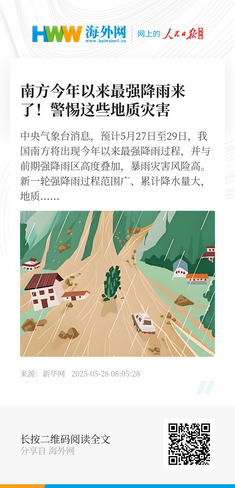 中央气象台消息,预计5月27日至29日,我国南方将出现今年以来最强降雨过程,并与前期强降雨区高度叠加,暴雨灾害风险高。新一轮强降雨过程范围广、累计降水量大,地质灾害风险不容忽视。强降雨可能引发哪些地质灾害?地质灾害发生前,有哪些征兆?如遇地质灾害,有哪些避险要点?
